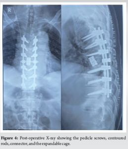Pedicle screws were placed at the T5, T6, T7, T9, T10, and T11 levels. An expandable cage was inserted at the T8 level along with contoured rods and an interrod connector to provide spinal stability (Fig. 4).