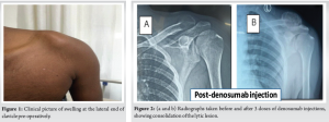 So we have a trial of denosumab injections to make it consolidate and make it easy for resection. Three doses of 60 mg subcutaneous denosumab were given at an interval of 1 month, and plain radiographs were taken before and after the injection as shown in (Fig. 2a and b).