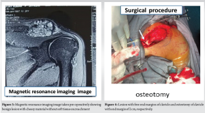 Magnetic resonance imaging (MRI) (Fig. 3) shows a benign lesion with cheesy material, no periosteal reaction, and without much soft tissue encroachment.