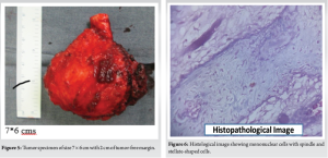 Incision – The lesion was well outlined with a marker, 10 cm. Horizontal incision was given over the lesion extending 2.5 cm medially over the normal clavicle shaft and laterally up to the acromioclavicular joint. Subcutaneous dissection was done. The tumor was exposed and 2 cm of tumor-free region of the clavicle medially was marked, and osteotomy of the clavicle was done (Fig. 4). The tumor was carefully separated from surrounding soft tissues and excision was done. Tumor size was 7 × 6 cm and was sent for histopathological examination (Fig. 5).