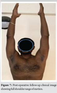 Immediately, on the next post-operative day, we started shoulder range of motion actively, and he attained full range of motion within 2 weeks and joined his regular activities.