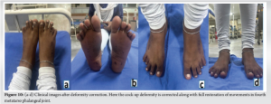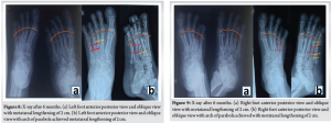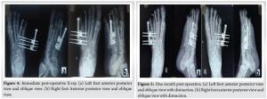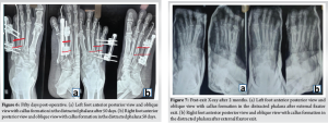 Post-operatively Immediate post op Xray taken followed by(Fig 4a,b) management with analgesics and antibiotics was started. Pin sites were regularly dressed to prevent post-operative infections. The patient was advised to be strictly non-weight bearing after surgery. Ten days post-operatively, the patient was given time for soft tissue healing and swelling to reduce. Distraction of the metatarsal was started with 0.25 mm twice daily. X-rays were taken every 10 days to check for callus formation, bone alignment, and MTPJ stability(Fig 5a,b). Distraction was conducted for 40 days, with X-ray showing regeneration of 2 cm along with callus and satisfactory arch of parabola connecting all metatarsal heads (Fig. 6a, b). The external fixator was removed after 2 months (Fig. 7a, b). After the fixator was removed and time was given for the callus to gain satisfactory strength, the patient was mobilized with full weight-bearing on day eighty[15].