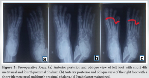 A 21-year-old female patient complained of deformity of both feet since her childhood associated with pain. The patient had undergone conservative modalities, such as orthotics, medical treatments, and insoles. The patient took physiotherapy with lifestyle modifications but had no pain relief. The patient felt that her feet were esthetically unpleasing (Fig. 1a and b). The patient was clinically evaluated and had shortening of bilateral fourth toes (Fig. 1a and b), tenderness over the bilateral fourth metatarsal ray, cock-up deformity over bilateral fourth toes, and sulcus sign over the plantar aspect of bilateral fourth toes. The patient had no comorbidities. The patient was evaluated for any associated syndromes and found to be negative. Pre-operative blood investigations and anesthesia fitness for surgery were obtained. A pre-operative plan was made using a bilateral foot X-ray. Anteroposterior and oblique views showed a 2-cm shortening in both fourth metatarsals (Fig. 2a, b) and a 5-mm shortening of the bilateral proximal phalanx (Fig. 2a, b) and malalignment of the Lelièvre parabolic arch[10] (Fig. 2c). A diagnosis of congenital bilateral brachymetatarsia of the fourth metatarsal was made. The patient was planned for lengthening of bilateral metatarsals using distraction osteogenesis with an external rail fixator[11,12].