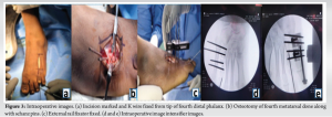 Under sterile aseptic precautions, under spinal and epidural anesthesia, the patient was positioned supine, and the parts were painted and draped. Skin markings for the extent of the fourth metatarsal were made under an image intensifier (Fig. 3a). A K-wire was passed into the fourth toe to immobilize the MTPJ to prevent dislocation (Fig. 3a, b, c, d, e)[13]. A 4cm skin incision was made along the fourth metatarsal extent (Fig. 3b). Subcutaneous tissue was cut and retracted. The extensor digitorum longus tendon was visualized and retracted. Four Schanz pins of size 2.5 mm were inserted (two proximally and two distally) (Fig. 3b). An osteotomy was performed after the circumferential drilling of the metatarsal shaft with a 1.5 mm K-wire with one entry and three exits. The external fixator was attached to the Schanz pins (Fig. 3c). Skin was closed in layers, and a sterile dressing was applied[14].