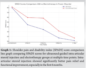 In contrast, patients managed with ET showed more gradual improvements. Although not as dramatic as UG-IASI in the early follow-up periods, improvements in pain and function were evident over time. ET, encompassing modalities, such as IFT, SWD, and therapeutic ultrasound, is aimed at modulating pain, improving circulation, and enhancing tissue extensibility. While these effects are beneficial, they tend to require repeated sessions and longer durations to produce clinically significant outcomes. The relatively slower progression of improvement in the ET group could explain the narrowing difference in SPADI scores between the two groups by the 1-year mark, where the results were no longer statistically significant [21].