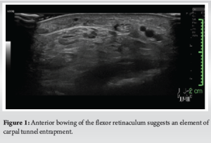 Postoperatively, despite improved range of motion, he experienced persistent hand and wrist pain without neurological deficits. Ultrasound revealed anterior bowing of the flexor retinaculum, indicating ACTS (Fig. 1).