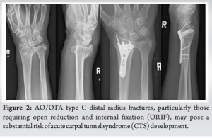 Distal radius fractures are the leading cause of ACTS. Earp et al. [8] identified open DRFs and also AO/OTA type C fractures as the main risk factors for developing the syndrome. Cooke et al. [9] reported a higher ACTS incidence in patients undergoing ORIF, likely due to high-energy trauma. Among the cases reviewed, three patients developed ACTS after surgical management of AO/OTA type C DRFs – one acute and two transient or subacute. The acute case occurred post-ORIF, suggesting a higher risk with this procedure. High-energy trauma, complete articular fractures, and open fractures appear to also increase ACTS incidence, likely due to post-operative swelling, hematoma, and biomechanical changes. This study highlights the need for vigilant monitoring and awareness of ACTS in such cases, notably in AO/OTA type C DRFs particularly those requiring an ORIF, as demonstrated by our study (Fig. 2). Finally, further research is needed to clarify the role of prophylactic carpal tunnel release, as its use in DRFs is debatable in medical literature.