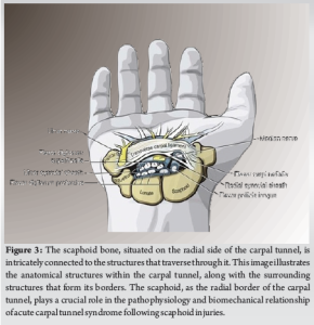 Scaphoid fractures, the most common carpal fractures (2–7% of all fractures and 60–70% of carpal fractures), can lead to ACTS (Fig. 3). Olerud et al. [3] reported ACTS within 3 h of scaphoid and fifth metacarpal fractures, while Lee et al. [10] described delayed ACTS from an old displaced fracture. Monsivais and Scully [11] noted persistent CTS due to median nerve compression by the scaphoid’s distal pole. Within our population, three cases presented with ACTS following scaphoid bone injury. Early neurovascular assessment is essential for timely intervention and optimal outcomes in such cases.