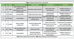 Introduction: Acute carpal tunnel syndrome (CTS) is a rare but serious condition requiring prompt diagnosis and intervention to prevent permanent neurological deficits. This case series presents our department’s experience in managing this condition, highlighting diagnostic challenges, treatment strategies, and patient outcomes.