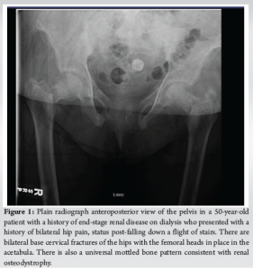 A 50-year-old female with a past medical history of ESRD on dialysis, coronary artery disease (CAD), hypertension, and dyslipidemia presented to the emergency department with bilateral hip pain after she had sustained a fall while at home just before arrival. Per Emergency Medical Services, the patient fell down a full flight of stairs. The patient states that she felt a “pop” with subsequent pain in the hips and has been unable to move her hips since. On physical examination, the patient was in no acute distress and was awake, alert, and oriented ×3 with no evidence of altered mental status. She had appropriate tenderness over the hips bilaterally. The patient was neurologically and vascularly intact with palpable dorsalis pedis pulses, warm toes, and intact sensation. An anteroposterior (AP) view X-ray of the pelvis (Fig. 1) and frog-leg lateral views of each hip individually were ordered. Universal mottled bone patterns consistent with renal osteodystrophy/secondary hyperparathyroidism with erosive and destructive changes on both sides of the pubic symphysis were visualized. Bilateral basicervical fractures of the hips were also noted. The patient also had a computerized tomography (CT) scan without contrast of the pelvis, which revealed acute transcervical fractures through the proximal femurs bilaterally and an acute displaced fracture of the left greater trochanter. Severe degenerative changes at the pubic symphysis with probable brown tumors in the pubic bone and L5 and S1 vertebral bodies were also noted, which were consistent with the X-ray findings. The patient also had a CT of the head without contrast performed, which did not reveal any significant findings.