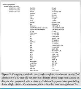 Based on these findings, the patient was consented for bilateral hip arthroplasties as a means of treatment due to her history of ESRD and metabolic bone disease, which led to bilateral pathological fractures of the hip. During the routine blood screening prior to surgery and during admission, it was discovered that the patient had hemoglobin (Hb) of 7.4, a mean corpuscular volume of 74, and was fecal occult blood test positive. She had no history of prior blood transfusions. The patient also tested positive for a rare alloantibody, a Cromer antibody, which was detected during the routine blood screening before surgical intervention No specific symptoms prompted further specialized testing beyond this pre-operative screening. On her 2nd day of admission, her Hb was at 7.8, and her blood was drawn and sent out to the Red Cross blood bank to search for compatible blood to be given before surgery. The patient refused autologous transfusion due to the risk of self-rejection, as she had a history of antibody-mediated sensitization and likely would have rejected her own salvaged blood intraoperatively. Local blood banks and the American Red Cross were contacted but were unable to provide compatible blood due to the patient’s rare blood antibody. As surgery was not emergent, the patient was rescheduled until blood products were available. In the interim, the patient was managed with Aranesp 200 mcg once weekly with dialysis, Venofer 200 mg once daily with a total of 5 doses, and folic acid 1 mg PO daily. Eventually, 2 units of frozen blood were located in Wisconsin and delivered to the hospital, knowing that the risk of hemolysis was significant. Risks were discussed with the patient, and the patient consented to having transfusions to proceed with her surgery. 1 week before surgery, the patient was transfused with 1 unit of blood given her history of CAD. A few days later, after receiving the transfusion, the patient suffered from uremia-induced encephalopathy and was unable to give consent, obligating her son to provide consent. The patient’s blood urea nitrogen was noted to be 67 mg/dL. The patient’s labs from that day can be seen in (Fig. 2). Despite decubitus precautions, the patient also suffered from decubitus ulcers of the sacrum. Multiple family meetings involving the nursing staff, hematology service, orthopedic surgery service, and social work resulted in the patient and her family agreeing to have the surgery, given the risks of bleeding, hemolysis, shock, and other life-threatening conditions. The morning of surgery, the patient was dialyzed and given the second unit of blood. The night before surgery, the patient’s Hb was 7.4 mg/dL.