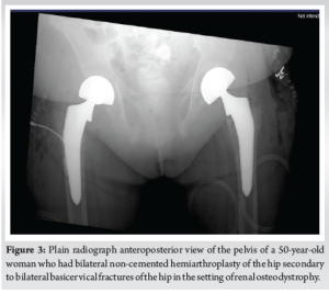 During her first post-operative clinic visit, the patient was alert and oriented, ambulating with a front-wheeled walker under supervision. On physical examination, the surgical wounds were clean and dry without signs of infection. She reported reduced pain in the hips and improved mobility compared to her pre-operative status. No dislocations or implant-related complications were noted on follow-up radiographs. The patient expressed satisfaction with the outcome and was referred for outpatient physical therapy to continue rehabilitation. Laboratory studies at follow-up showed stable Hb levels and improved renal parameters with dialysis. The patient’s last known follow-up was approximately 6 months post-operative. The patient resided in a nursing home, demonstrated improved mobility, and maintained stable prostheses with no reported complications.