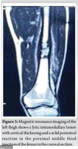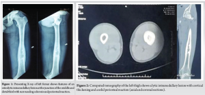 A 17-year-old boy reported a history of closed injury to the left thigh while playing kabaddi 7 months back. At first, he felt only some discomfort, and he could proceed to do normal activities. Four months post-injury, there was the onset of pain in the left thigh, which was aggravated on movement and weight bearing but relieved with rest. There was no history of fever, night cries, or weight loss. The patient presented to us 6 months after the trivial injury.