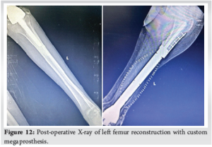 An open biopsy was again repeated along with the surgical oncology team. The tumor was exposed through the medial approach. Sample taken from the transitional zone/margin of the lesion was sent for frozen section (FS) (Fig. 8) which showed atypical cells with numerous osteoclast giant cells and chronic inflammation suggestive of high-grade sarcoma (Fig. 9). The routine histopathological examination showed atypical cells with focal area showing malignant osteoid with numerous osteoclasts such as giant cells, hemorrhage and focal necrosis (Fig. 10). Immunohistochemistry for SATB2 (Fig. 11) was strongly positive in the atypical cells with a high Ki67 proliferative index hence a diagnosis of osteosarcoma was made. The patient received five cycles of MAP chemotherapy and left femur reconstruction with custom intramedullary prosthesis with free flap coverage (Fig. 12). No adverse effects were noted during the post-operative period, but on subsequent follow-up patient developed pulmonary metastatic lesions.
