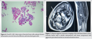 Thus, the patient was treated with empirical intravenous followed by oral antibiotics. However, a couple of weeks later, he returned with an increase in the size of the swelling and severe pain. Restriction of movement in both hip and knee joints of the left limb was noted. Repeat MRI and positron emission tomography -CT was done, which showed a large lytic sclerotic lesion with calcific extraosseous soft tissue component with aggressive periosteal reaction indicative of malignancy (Fig. 7).