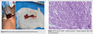 In this situation, the surgical oncology team intervened, and an FS conducted during the open biopsy was the turning point. By showing high-grade osteosarcoma, FS analysis gave instant intraoperative data that helped with real-time surgical planning. Unlike needle biopsy, FS lets you see directly the transition zone and tumor margins, hence providing a more precise diagnosis. This not only allows quick tumor confirmation but also helps to avoid several biopsies and start early treatment.