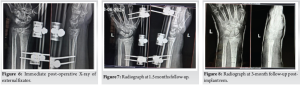 After the surgery, the wrist is placed in a splint or cast to prevent movement and support the initial healing process. Follow-up involves the use of sequential radiographs to evaluate the healing of the fracture and the correct positioning of any surgical implants. Dorsal distraction plating provides strong stabilization, allowing for prompt movement and restoration of function. Physical therapy is started once X-ray imaging confirms that the wrist has healed enough to regain its range of motion and strength. Subsequently, after the removal of the implant, adhesiolysis is carried out during the surgery to regain the mobility of the wrist joint. Dorsal distraction plating X-rays (Fig. 1, 2, 3, 4). ExFix X-rays (Fig. 5, 6, 7, 8, 9).