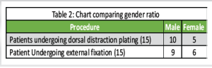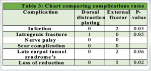 Results: The average ages across the bridge plate and ExFix sections were 40 and 43 years, respectively. The cohort of patients who had bridge plating exhibited a greater prevalence of male individuals (P = 0.011). The ExFix group had elevated infection rates, which can be ascribed to the occurrence of pin tract infections. Both the groups did not show any instances of nerve palsy. Patients who received dorsal distraction plating expressed higher levels of satisfaction with their post-operative results, both in terms of functionality and appearance .