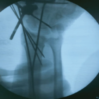 Fluoroscopic guiding is employed to percutaneously introduce Schanz pins into the bone. The positioning of these pins is done with great care to prevent any damage to neurovascular structures and to ensure the best possible stability. Subsequently, the pins are linked to an ExFix structure that can be modified to attain accurate alignment and reduction of the fracture.