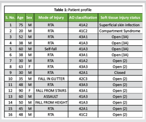 All patients were examined for injuries and primarily stabilized using skeletal traction, limb elevation on a BB splint, IV fluids, blood transfusions, and vasopressors if necessary. The patient was given anti-tetanus prophylaxis and started on intravenous antibiotics covering both gram-positive and gram-negative organisms. The wound was thoroughly cleaned and debrided, followed by stay sutures if possible. After stabilization of the vitals of the patient, fracture anatomy was evaluated through X-rays in both anteroposterior and lateral views. A computed tomography scan was taken when needed. Fracture was classified according to the AO classification and soft tissue injury in open fracture was assessed with Gustilo-Anderson Classification.