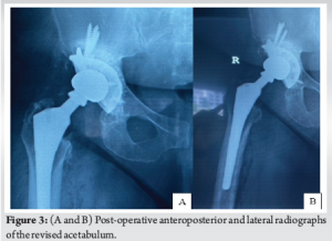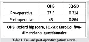 We incorporated the old incision and used a modified Hardinge approach to the hip. The soft tissues appeared healthy with minimal embedded metal debris, and there was no evidence of infection. The femoral head was easily removed, and the Morse taper was in good condition without signs of trunnionosis. After removing the acetabular shell, the exposed bony floor showed only minor cavitary defects, and the walls and columns were intact. We prepared the acetabulum in routine fashion, but without the benefit of morselized allograft, using a bone graft substitute (Medbone® Biomaterials, Portugal) to fill the defects. The bone graft substitute was contained by an acetabular cage (Contour, Smith and Nephew) secured with multiple screws. An all- polyethylene cup was cemented in place with Palacos® R (Heraeus Medical, Germany) cement, and a Bioball® adapter and femoral head (Merete, Germany) compatible with the Type one taper on the retained femoral stem, impacted in place (Fig. 2). The hip was reduced and cycled through its range of movement to ensure stability. The patient recovered well, and post-operative radiographs were satisfactory (Fig. 3). At the 2-year follow-up visit, the patient is delighted with her function, reporting only mild hip pain and has returned to full-time work, as shown in Table 1.