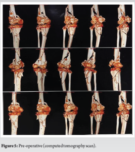 On August 13, 2024, due to inadequate radiographic signs of union and persistent discomfort, the Ilizarov fixator was removed (Fig 5). A computed tomography (CT) scan was performed, revealing non-union at the femoral-tibial junction, with sclerotic bone ends, a persistent fracture gap of approximately 1.5 cm, and no evidence of bridging trabeculae – confirming atrophic non-union.