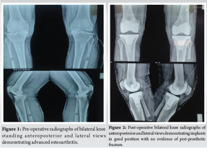 A 64-year-old male presented with complaints of bilateral knee pain and difficulty in activities of daily living for the past 5 years. He was a known diabetic on treatment. There was no history of any known allergies. Radiographs revealed bilateral end-stage osteoarthritis of the knee (Fig. 1). He had undergone a bilateral proximal fibular osteotomy 2 years prior for similar complaints. The patient was planned for bilateral total knee replacement after an anesthetist’s clearance. He was taken up for surgery under pneumatic tourniquet control. The tourniquet time for the right knee was 100 min, and for the left knee was 90 min. The skin was prepared with chlorhexidine and betadine solution. An OPSITE adherent dressing was applied over both knees. The medial parapatellar approach was used. Exactech cruciate retaining cemented implants were used in both knees. The surgery went uneventfully. Ranawat cocktail containing bupivacaine (0.5%), morphine sulphate (8 mg), epinephrine (1:1000), methylprednisolone acetate (40 mg), and cefuroxime (1.5 g) was infiltrated in the posterior capsule and gutters. The skin was closed with a suction drain inside, and a sterile dressing with cotton gauze piece and gamjee pad was done. The tourniquet was deflated once dressings were applied. Routine deep venous thrombosis prophylaxis injection enoxaparin 40 mg subcutaneously was started.