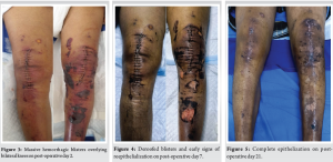 Case Report: A 64-year-old male with bilateral advanced osteoarthritis of the knees underwent bilateral total knee replacement in the same sitting. Surgery was done under strict aseptic precautions and tourniquet control. The procedure went uneventfully. Postoperatively, on the 2nd day, the patient developed massive hemorrhagic blisters around the operated site in both legs. Doppler scans showed no evidence of deep vein thrombosis. The blisters were managed by intravenous antibiotic coverage and soft, non-adherent collagen dressings. The blisters healed and reepithelialized by 3 weeks. A range of motion exercise was initiated on the 2nd post-operative day, as tolerated. At the final follow-up of 1 year, the patient had satisfactory Oxford Knee Scores.