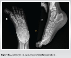 A 7-year-old healthy, fully vaccinated boy was brought by his parents to our institution’s pediatric ED complaining of right big toe deformity and open wound after a history of trauma while playing with his sibling at home, described as tripping on a hyper-plantarflexed big toe. (Fig. 1 and 2).