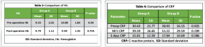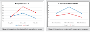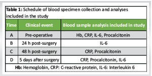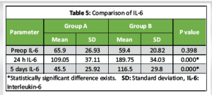 Haemoglobin (Hb) was measured using peripheral venous blood sample. The sample was collected in tubes and Vacutainer tubes containing ethylenediaminetetraacetic acid (K2EDTA). Blood was collected for evaluation for IL-6 in an K2EDTA vial and sent for analysis pre-operatively and post-operative day 1, 2, and 5. The tubes were immediately sent to the laboratory to be processed. Serial blood samples were collected as per the schedule given in Table 1. The samples were collected in tubes and vacutainer tubes containing ethylenediamenetetraacetic acid. Data were entered using Microsoft Excel software (Microsoft Office Excel 2010). Continuous variables are presented as means. Categorical and nominal variables are presented as percentages. This study was approved by the Institutional Ethical Review Board.