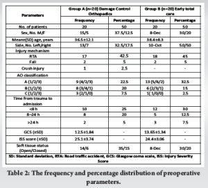 During this study period 40 patients with diaphyseal femoral shaft fractures meeting the inclusion criteria presented to our institute. After random allocation, 20 patients underwent surgery with External fixation with the purpose of DCO, collectively referred as Group A. The other 20 patients were allocated group B. Early absolute care was done in them with antegrade reamed intramedullary femoral nail. The mean age of patients in Group A and Group B was 35.5 years and 38.4 years respectively and did not differ significantly (P = 0.59). There was a male preponderance in both the study groups. Other general data were collected from the patients regarding side of injury, type, mechanism of injury, time since trauma to admission, ISS score, GCS, soft-tissue cover (Table 2). Both treatment groups were comparable in terms of general data preoperatively.