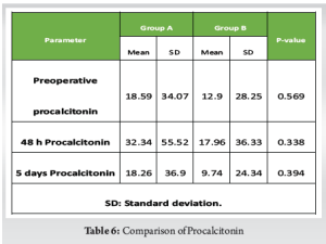 Serum procalcitonin analysis showed an initial increase of mean values in both the groups whereas at 5 days, the ETC group had a lower mean procalcitonin level that did not differ statistically (P = 0.394) (Table 6 and Fig. 4).