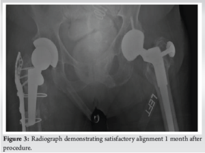 Six-month post-operation, the patient reported no discomfort in the right hip and was able to return to her nursing facility. X-rays showed that all hardware was intact and demonstrated good bone healing.