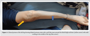 An 18-year-old female presented to the orthopedic outpatient clinic with pain in the left leg and difficulty walking for the past 2 years. There was a history of trivial trauma 2 years ago, which was managed with analgesics and anti-inflammatory medications. The pain was localized to the middle of the leg, mild-to-moderate in intensity, dull aching in character, and was aggravated by prolonged walking and relieved on rest and with medications. There was no history of fever, weight loss, or any other constitutional symptoms. There was a history of soft-tissue swelling involving the left thigh and knee since birth, which progressed over time, but the patient had not taken any treatment for the same. On physical examination, dilated tortuous veins with a soft blue mass were present around the distal left thigh and knee, suggesting venous malformation (Fig. 1).
