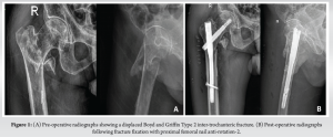 An 80-year-old male presented to our emergency department with a history of a slip and fall at his residence. Following this, he had pain in the right groin and was not able to bear weight on his right lower limb. On examination, the limb was shortened and externally rotated. There was fullness over the right groin, right hip, and greater trochanter, which were tender with restricted hip movements. Radiographs showed Boyd and Griffin Type 2 intertrochanteric fracture with medially displaced lesser trochanter, flexed proximal fragment, adducted, and proximally migrated distal fragment (Fig. 1).