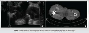 The patient underwent closed reduction and internal fixation with short proximal femoral nail anti-rotation (PFNA-2). Intraoperatively, the reduction was achieved by manipulation of the flexed and adducted proximal fragment with the help of a bone lever (Fig. 1). Intraoperative and post-operative periods were uneventful. The patient was discharged on post-operative day 6, the surgical wound healed, sutures were removed on post-operative day 15, and the patient was mobilized with partial weight bearing with walker support. The patient presented to us again on post-operative day 21 with complaints of pain and swelling over the right thigh. There was no history of fever or re-trauma, and the patient was able to walk full weight bearing with walker support. There was a pitting type of edema in his right lower limb extending up to the right proximal thigh. There was diffuse fullness over the anterior aspect of the thigh, which was more prominent on quadriceps contraction. All the peripheral pulses were well felt, there was no calf tenderness, and no neurological deficits. High-resolution ultrasonography showed a well-defined hetero-echoic collection in the proximal thigh in anterior and medial aspect with central anechoic area probably communicating to the femoral artery measuring 6.2 × 6.9 × 10.2 cm and showing Yin–Yan sign in color Doppler suggestive of pseudoaneurysm with peripheral thrombosis (Fig. 2). The computed tomography (CT) angiography of the right lower limb showed a well-defined contrast filled saccular outpouching with smooth surface seen arising from posterior wall of proximal portion of profunda femoris artery distal to common femoral artery bifurcation. There was no evidence of thrombus within the outpouching. Surrounding organized hematoma noted in the anterior and medial aspect of the thigh, approximately measuring 6.5 × 8.5 × 14 cm, suggestive of pseudoaneurysm of the right profunda femoris artery (Fig. 2).