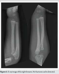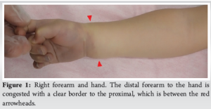 Conclusion: The toddler was injured by a low-energy fall, which was atypical enough to suggest the onset of ACFS. Congestion beyond the wrist, with a clear border to the proximal area, indicating peripheral circulatory disturbance, was the most notable physical finding in this case.
