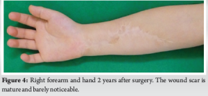A 2-year-old boy was taken by his parents to the emergency department of our hospital 3 hours after falling from a chair. He had no family history of congenital hemorrhagic diseases nor anticoagulant medications. In his physical evaluation, he was crying and was found to be in right extremity pain with diffuse swelling and firming of the forearm. His right distal forearm to hand was congested with a clear border to the proximal forearm (Fig. 1), although the right radial pulse was palpable. He resisted attempting passive finger movement due to pain. It could not confirm his active finger movement, assess his sensory disturbance of the hand because his verbal ability was immature, nor detect any fractures in the X-rays of his right wrist, forearm, and elbow (Fig. 2). We found that the physical evaluations satisfied only two of the five P sign, which were pain and paralysis. Still, we diagnosed him with AFCS without fracture and immediately decided to perform a fasciotomy. According to his laboratory data, the platelet count was within the standard limit. However, neither bleeding time, prothrombin time, activated partial thromboplastin time, nor international normalized ratio was examined. Neither computed tomography (CT), magnetic resonance imaging (MRI), Doppler ultrasonography, nor angiography was performed, as the shortening of time to surgery was chosen over the findings obtained from these tests. The intra-compartmental pressure of his right forearm was elevated over 80 mmHg under general anesthesia before surgery. Carpal tunnel release and extensile fasciotomy were performed in the dorsal, superficial volar, and deep volar compartments of his right forearm. A hematoma was found in the carpal tunnel of the distal forearm, and curettage was performed between the superficial and deep volar compartments (Fig. 3). Neither the radial nor ulnar arteries were occluded or blew actively. None of the vascular tumors around the carpal tunnel, vascular malformation of the arteries, or necrosis of the forearm muscles was observed. Following carpal tunnel release and fasciotomy, the tension of each compartment of the forearm was relieved, and the congestion of the hand improved immediately. Since primary closure was not possible due to soft-tissue swelling, the shoelace technique was used initially. Postoperatively, intravenous cefazolin sodium, 0.4 g every 12 h, was given for 48 h to prevent surgical site infection. For pain management, intravenous acetaminophen was given as needed. No occupational therapy was started during the postoperative period. On the 23rd postoperative day, an attempt was made to achieve partial primary closure. However, during suturing, high tension made it challenging to palpate the radial artery, potentially blocking blood flow. Consequently, the remaining areas were covered with split-thickness skin grafts. After surgery, to prevent scarring at the incision site, tension reduction with tape and topical application of heparinoid were continued for 6 months afterward. Two years after surgery, he had no signs of motor and sensory neurological defects in his right upper extremity. Given that he was only 4 years old, evaluating his upper limb function was not possible by patient-reported measures such as the Quick-Disabilities of the Arms, Shoulders and Hands. He also had a barely noticeable matured wound scar without hypertrophic scarring or skin contracture (Fig. 4). Moreover, he has never experienced episodes indicating potential hemorrhagic tendency or vascular disorders.
