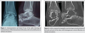 A 16-year-old girl student, from the Benin Republic, presented in our department with increasing right ankle pain. These pains began suddenly 4 months ago, without any trauma, and were maximal on walking. There was no fever, swelling, or weight loss. Personal and family histories were non-contributory. Physical examination was normal. Right ankle radiographs and computed tomography (CT) scan (Fig. 1 and 2) showed an osteolysis lesion type I a of Lodwick et al. [5], of the body and neck of the talus, with heterogeneous cortical effraction on the subtalar articulation.