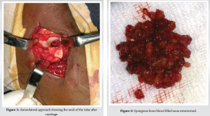 Based on these findings, a diagnosis of pathologic fracture of the talus due to a benign tumor was retained. Unicameral bone cyst, ABC, and giant cell tumor were suspected. The patient was operated 2 weeks later. By an anterolateral approach of the ankle, with a skin incision of approximately 10 cm, anterior to the distal end of the fibula, curving toward the base of the fourth metatarsal, paying attention to the superficial fibular nerve. The superior bundle of the extensor retinaculum is transected. The extensor digitorum brevis tendon is split longitudinally and retracted, exposing the lateral aspect of the talar neck. The talus was exposed. A trepanation was made on the neck of the talus (Fig. 3) with a trocar and extended intra-lesional curettage was performed progressively using bone curettes of different sizes, revealing a spongious bone blood-filled mass (Fig. 4).