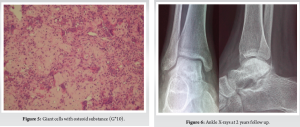 The ABC is a rare benign osteolytic tumor, which is seen in 0.14/100,000 of the population per year [1,6]. Considered as a pseudo-tumor due to the lack of an epithelial lining, it occurs in the first two decades of life [1-3]. There are various forms of this benign lesion: Primary ABC, secondary ABC, solid ABC, or giant cell reparative granuloma, and soft-tissue aneurysmal cyst [1,2]. Secondary ABCs are less common and associated with trauma or another tumor, such as giant-cell tumors, chondroblastomas, or osteoblastomas. Fibrous dysplasia, chondromyxoid fibroma, nonossifying fibroma, osteosarcoma, chondrosarcoma, unicameral bone cyst, hemangioendothelioma; but the most frequent are the primary ABC, which represents 70% of all ABC diagnoses [2,3,6]. The case of our patient is a primary ABC. Since its first description, the etiology and pathogenesis of this tumor have been unclear and still controversial [3,6]. One theory states that ABC is the result of local circulatory disorders [1,3]. Other authors claim that it is a hereditary factor with chromosomal translocation abnormalities [1,2]. All these theories have shown that the etiopathogenesis of this lesion is multifactorial. This neoplastic process is frequent in young age (90% before the age of 20 years) and there is a slight female preponderance [1,6]; our patient was a 16-year-old girl. The preferential location of ABCs is the metaphysis of long bones, flat bones, and vertebrae; locations in the feet and hands are exceptional [1,3,6]. In the foot, they can involve the calcaneus, the navicular, and the talus [4,7,8]. The talus was a very rare location for this tumor; a few cases were found in the literature, and the subjects were slightly older than our case, aged 20–28 years [2-4,9]. Clinically, ABC can be revealed by pain, swelling, pathologic fracture, and neurologic symptoms when the axial skeleton is concerned [1,2]. The case reported was revealed by pain and pathologic fracture. The radiographic and CT features of ABC are not pathognomonic and are rather conflicting. Magnetic resonance imaging is the best choice to complement X-ray [2,6], but this imaging was not available in our country at the time we took care of the patient. The typical aspect in this exam is an expansive, lobular, or septate lesion. Multiple fluid levels may be detected on T2-weighted axial sequences [1]. Biopsy is essential for the diagnosis of ABC and can be performed by trocar or surgically, in the form of curettage-biopsy [2]. In our case, a surgical curettage-biopsy was carried out, followed at the same time by an autologous bone graft. Histologically, there is three types of ABC: The first one is the “classic or vascular” form which is a multiple sinusosidal blood-filled spaces separated by fibrous septa, with multinucleated giant cells and osteoids; the second histological form is non-cystic variant with solid gray-white tissue with hemorrhagic foci and abundant of fibroblastic and fibrohistocytic elements with osteoid and calcifying fibromyxoid tissue (solid form) and the last form is the “mixed” form, with elements of both vascular and solid types [2,3]. Our case corresponded to the first histological type. Although ABCs are benign lesions, occasionally they may behave as a locally aggressive, rapidly expanding, and locally destructive mass, which may be misdiagnosed as a malignant neoplasm [2,6]. The treatment of ABC included observation, intracystic injection, embolization, resection, and intralesional curettage alone or associated with a high-speed burr with/without argon beam coagulation, bone grafting, and also partial/total talectomy with tibiocalcaneal arthrodesis [2,4,10]. Furthermore, there are not some technologies, such as embolization, argon beam coagulation, in a low-income country like ours. That’s why we chose the option of curettage and bone grafting. Surgical access to the talus generally involves a medial malleolar osteotomy [11]; it can be done by the anteromedial approach [12], or even by the arthroscopic approach [9]. In our case, the approach was anterolateral with direct access to the neck of the talus, which was trephined; this allowed us to work easily. This access of the talus by non-articular way (neck of talus) could reduce the risk of tibiotalar arthrosis occurrence. ABCs are known to have a high recurrence rate (20–30%) due to remnants of lesions and usually reoccur within the first 12 months after initial treatment [2,13]. Even if the risk of reccurence exists with it, many authors have described excellent results with intralesional curettage and bone grafting for lytic lesions that were localized within the talus [4,14]. In our case, no recurrence was noted, even after 5 years of follow-up.
