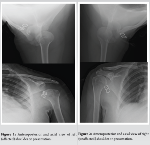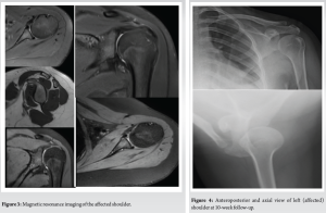 A 15-year-old female reported to the outpatient department (OPD) with pain over the left shoulder associated with restricted mobility of the same shoulder. She was suffering from the same over a period of last 1½ years. She reported no history of trauma or any prior significant physical insult to the shoulder. She had consulted multiple doctors and specialists in her home city. She was treated with analgesics and muscle relaxants for the same. The symptoms were relieved intermittently. Examination in the OPD on presentation revealed restriction of active abduction of the shoulder to 30°. External rotation was also restricted to 40°. The patient had adapted to her condition and was employing torso rotations along with elbow and wrist movements to fulfil her daily needs. The contour of the left shoulder had noticeably flattened on comparison with the right. Sulcus and Gagey signs were negative. Neurological examination showed no significant abnormality. An interesting finding revealed that she was able to voluntarily “click” (reduce) her shoulder after which her active range of motion would improve by 10–15°. The Beighton score for the patient was 4/9 and the other shoulder was normal on clinical examination. The patient was then investigated radiographically which revealed a gross inferior subluxation of the shoulder. Further investigations were carried out which included a detailed magnetic resonance imaging (MRI) scan and a limited computed tomography (CT) scan. The imaging findings have been included below. She was never investigated radiographically, hence comparison with any previous reports was not possible. Based on the radio-clinical examination, a provisional diagnosis of Inferior non-positional, controllable functional shoulder instability (FSI) due to idiopathic deltoid atony was thought to be the best fit in this scenario. The patient’s shoulder was placed in an arm sling for immobilization. Immediate physiotherapy rehabilitation was carried out. A thorough follow up was ensured.