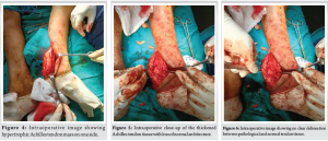 Bilaterally, the swelling was firm and adherent to the underlying Achilles tendon and was moving with the plantar flexion. The overlying skin showed no erythema or ulceration, no signs of inflammation. There was no local rise in temperature, tenderness, or any neurovascular compromise. The lipid profile of the patient did not show any derangement. The patient was sent for radiographs, which showed diffuse soft-tissue swelling without bony abnormalities or calcification bilaterally (Fig. 3). Ultrasonography (USG) yielded diffuse uniform thickening of tendons with loss of normal fibrillary architecture bilaterally. Magnetic resonance imaging (MRI) showed fusiform enlargement of the entire Achilles tendon on both sides, extending from the musculotendinous junction to the calcaneal insertion. The internal heterogeneity in the lower 1/3rd of the tendon was suggestive of a high-grade partial interstitial tear and underlying myxoid degeneration. Mild edema in the fat anterior to the Achilles tendon was also noted. The patient was planned for en masse resection of the swellings bilaterally and was taken to the operating theater. Intraoperatively, en masse resection was not found to be feasible, as the swelling was completely integrated with the Achilles tendon, with no clear interface between the tendon and the pathological tissue (Fig. 4-6).