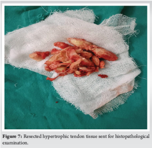The tendon showed hypertrophy with loss of normal tissue architecture, due to which debulking of the swelling was done, and tendon repair was done using the Krackow technique with Ethibond no. 5 suture, and closure was done in layers, and a below-knee backslab was applied for immobilization. Resected tissue (Fig. 7) was sent for histopathology examination, which showed a xanthomatous lesion with fibroconnective tissue with numerous foamy macrophages and giant cell reaction with cholesterol clefts.