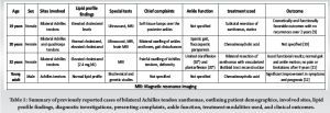 Keywords: Achilles tendon xanthoma, tendon xanthoma, hyperlipidemia, cerebrotendinous xanthomatosis, familial hypercholesterolemia.