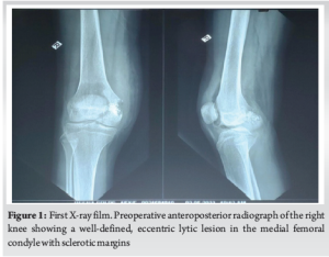 A 15-year-old girl presented with a 6-month history of right knee discomfort, which progressively worsened over time. The pain was insidious in onset and was notably aggravated by weight-bearing activities and sitting cross-legged. Although initially intermittent and relieved by analgesics, the discomfort gradually increased in intensity, interfering with her daily activities. She noticed a swelling over the medial aspect of her right knee. The swelling was progressive and unrelated to redness, warmth, or systemic symptoms such as fever, weight loss, or appetite changes. She denied any history of trauma, previous similar complaints, or swelling in other areas. Interestingly, she reported experiencing nocturnal pain – a characteristic symptom of bone tumors – but no variation in discomfort during the day. On local examination, an irregular, poorly defined swelling was palpated 4 cm medial to the patella. The overlying skin appeared normal, with no signs of discoloration or ulceration. Further examination revealed tenderness over the medial tibial and femoral condyles. The swelling was firm, immobile, and seemed closely associated with the underlying bone. Mild suprapatellar fullness was noted. There was no joint crepitus, and the knee maintained a full range of motion from 0 to 130°. The patient’s gait was normal, and there was no limb length discrepancy. Growth plate involvement was not quantified using growth scanograms, which would be useful to monitor for potential physeal arrest or future limb length discrepancy. Radiographs showed a well-demarcated lesion in the medial femoral condyle on the anteroposterior view. MRI and CT confirmed a lesion in the medial femoral condyle. Chondroblastoma was suspected in view of the calcification of the matrix. (Fig. 1).