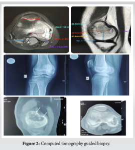 Performing a CT-guided biopsy of the right medial femoral condyle verified the chondroblastoma diagnosis (Fig. 2).