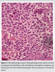 Histopathology showed round to polyhedral chondroblasts with eosinophilic cytoplasm, well-defined cell boundaries, and nuclei with scattered chromatin, intermingled with osteoclast-like large cells, showed. Notable was also a chondroid matrix with typical “chicken-wire” calcification, diagnostic of chondroblastoma (Fig. 3).