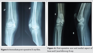 Under general anesthesia and tourniquet control, the medial femoral condyle was exposed by a direct medial incision and medial subvastus approach. Based on the measurements made using CT and MRI (distance of margin of lesion from the articular surface of the distal femur and anterior femur), a window was made in the medial femoral condyle and the lesion was located. Extensive curettage was performed using a burr to ensure complete removal of the tumor. The curetted tissue was sent for histopathological examination. The cavity was then thoroughly irrigated with hydrogen peroxide to eliminate residual tumor cells. Chemical adjuvants such as phenol or anhydrous alcohol were avoided due to their potential chondrotoxic effects, particularly concerning a weight-bearing epiphyseal site. Cortico-cancellous bone graft was harvested from the iliac crest. The subchondral region of the bone defect (posteriorly and distal) was layered with autograft. The residual void was filled with a mixture of autograft and 5 cc of synthetic Tricalcium phosphate bone graft substitute (Fig. 4).