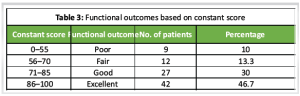 Materials and Methods: This retrospective cum prospective clinical study was conducted over 2 years and included 30 patients aged 18–65 years with PHFs treated surgically with PHILOS plating. Fractures were classified using Neer’s classification. Patients were followed for a minimum of 4 months. Functional outcomes were assessed using the Constant-Murley score.